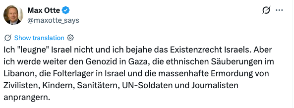 In seinem eigenen Begleittext bemüht Otte die klassische rhetorische Nebelkerze: Er bejaht das Existenzrecht Israels, nur um es im nächsten Halbsatz durch die unkritische Übernahme von Kampfbegriffen wie „Folterlager“, „Massenmord an Zivilisten“ und „Journalistenmord“ moralisch in Schutt und Asche zu legen. Es ist die Analyse einer schleichenden Radikalisierung. Wer jahrelang vor dem Zerfall des Rechtsstaates in Deutschland warnte, scheint nun kein Problem damit zu haben, die Verteidigungsschlacht eines Rechtsstaates mit dem Vokabular der radikalen Linken zu delegitimieren.