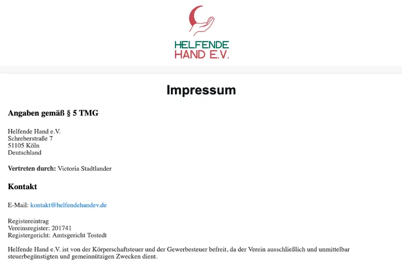 Die erste große Diskrepanz offenbart sich im Impressum der offiziellen Webseite. Dort wird ein „Helfende Hand e.V.“ mit Sitz in der Schreberstraße 7 in Köln geführt. Als zuständiges Registergericht wird jedoch das Amtsgericht Tostedt in Niedersachsen genannt, inklusive der Registernummer VR 201741. Für jeden Juristen ist dies ein rotes Tuch: Ein Verein muss zwingend dort eingetragen sein, wo er seinen Sitz hat (§ 57 BGB). Ein Kölner Verein in einem niedersächsischen Register ist rechtlich unmöglich.
