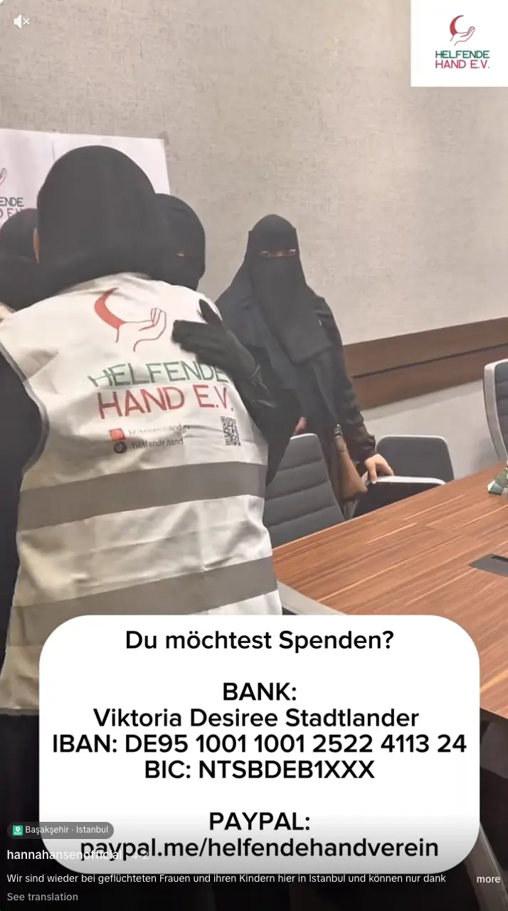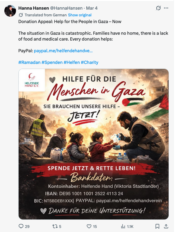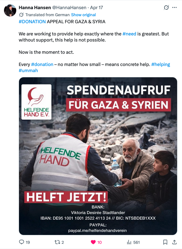 Unter dem Label „Helfende Hand e.V.“ sammelt die vom Verfassungsschutz beobachtete Akteurin seit Mitte 2025 Spenden für Marokko, Gaza und Syrien, Tschad und wo auch immer noch.