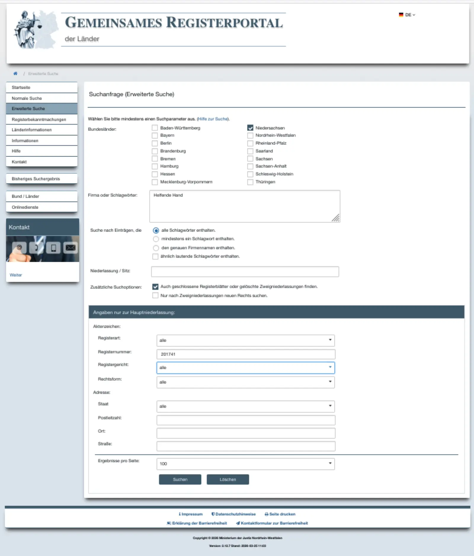 - Das Phantom-Register: Im Impressum der Webseite wird ein „Helfende Hand e.V.“ mit Sitz in Köln und der Registernummer VR 201741 beim Amtsgericht Tostedt geführt. Eine Abfrage im gemeinsamen Registerportal der Länder ergibt jedoch: Unter dieser Nummer existiert in Tostedt kein solcher Verein. Auch am angegebenen Sitz in Köln ist keine entsprechende Organisation registriert.